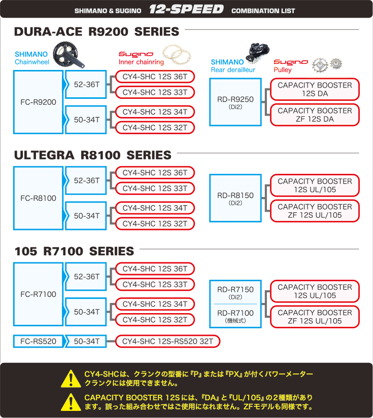 また、CY4-SHCにはCAPACITY BOOSTERシリーズが必要となる場合がありますので、こちらも互換性を確認の上ご使用ください。(※CAPACITY BOOSTERはCY4-SHCに限らず、シマノ製インナーチェーンリングとの組み合わせでもご使用いただけます。)