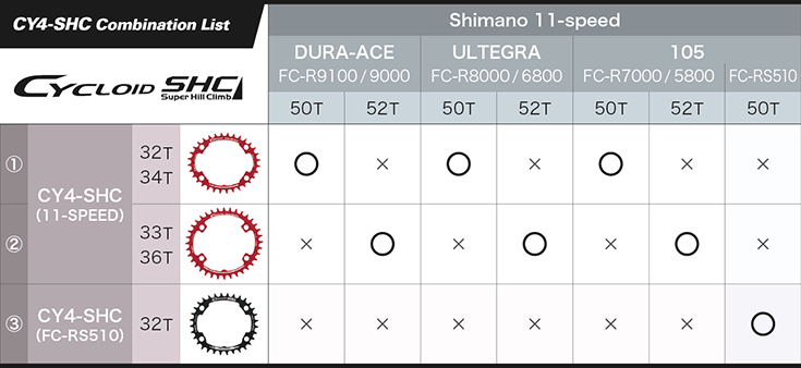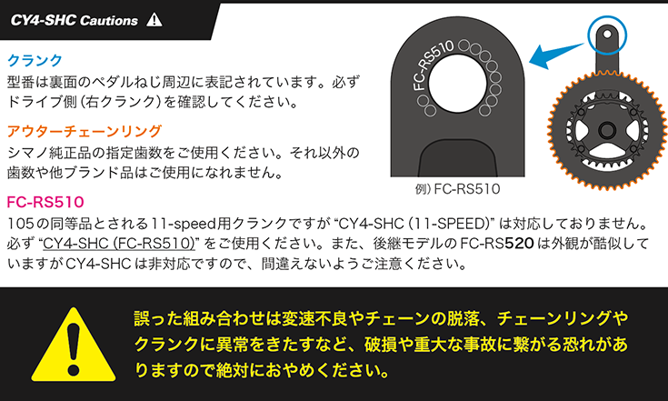 CY4-SHCシリーズは、シマノ製クランク用のインナーチェーンリングです。それぞれ対応しているクランクおよびアウターチェーンリングが異なりますので、必ず指定の組み合わせにてご使用ください。