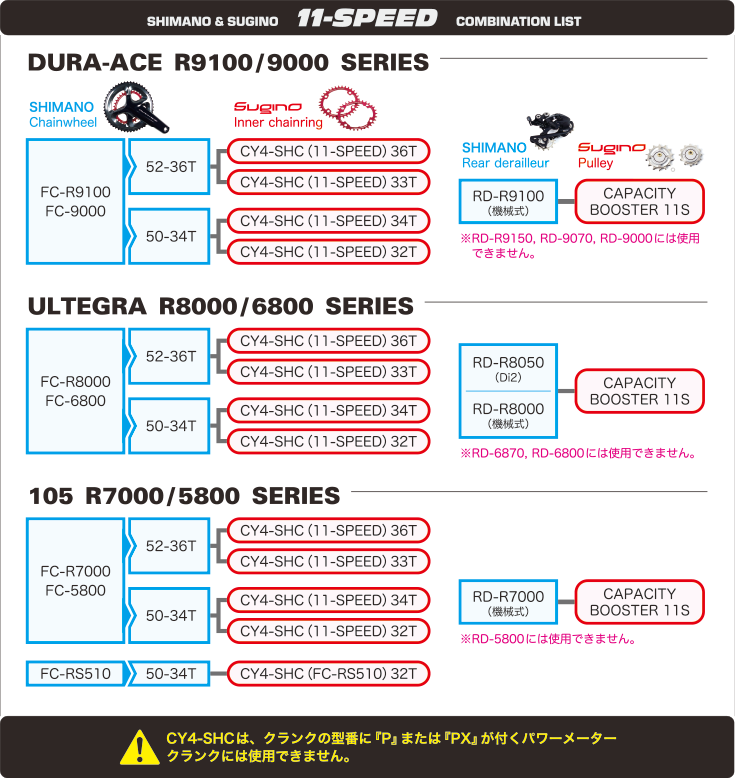 また、CY4-SHCにはCAPACITY BOOSTERシリーズが必要となる場合がありますので、こちらも互換性を確認の上ご使用ください。(※CAPACITY BOOSTERはCY4-SHCに限らず、シマノ製インナーチェーンリングとの組み合わせでもご使用いただけます。)