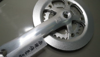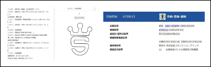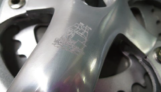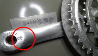 これらクランクセットのクランクアーム裏面ペダル穴付近に下記写真に示す商標(いわゆる「クラウンSマーク」)が刻印されている製品は、弊社の商標登録第4709513号の商標権侵害に当たります。
