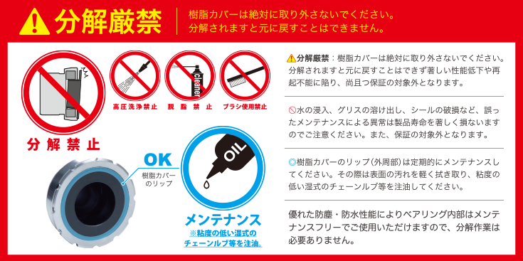 なお、ベアリングの打ち換えを行った改造品は弊社保証対象外であり、その使用において故障や事故が発生した場合、弊社は一切その責任を負いかねます。